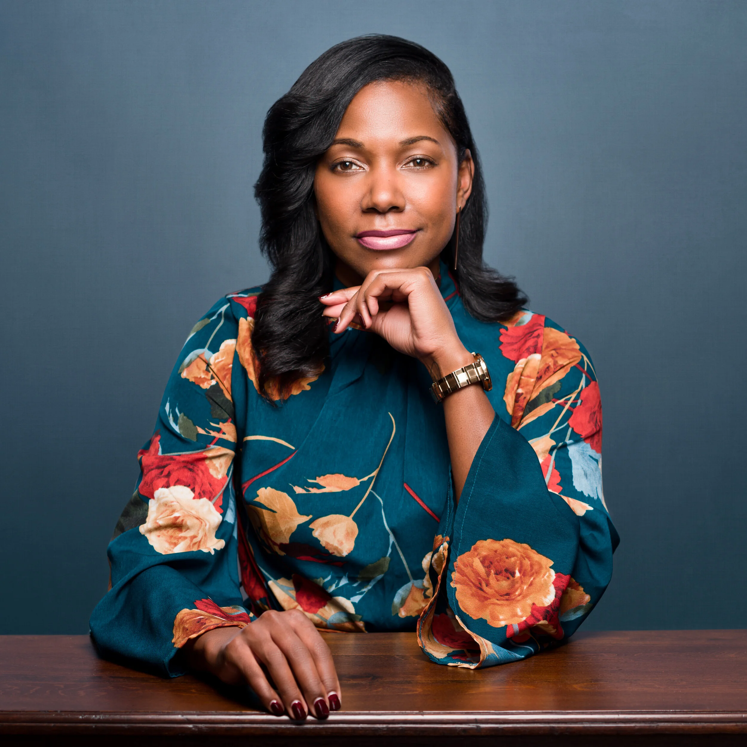 The headshot in the jacket was for a company website which required the blue background. So I included both in delivery as a courtesy. The table shot was for a personal/business website. The reason for the alternate background there was to match the hue of the dress. I'm not a big fan of prints because I love faces and see prints as a competition to my subject's most important feature. So shifting the background to the same teal hue as the dress seemed like a way to help bring focus to her face. Since the gray is what we shot on, why not include that in the order? Of late I've been adding a bit of texture to my studio background shots. "Moire" and "banding" is becoming more and more of an issue on social media sites. Having some texture helps mitigate that. But even more than that, I love the look.